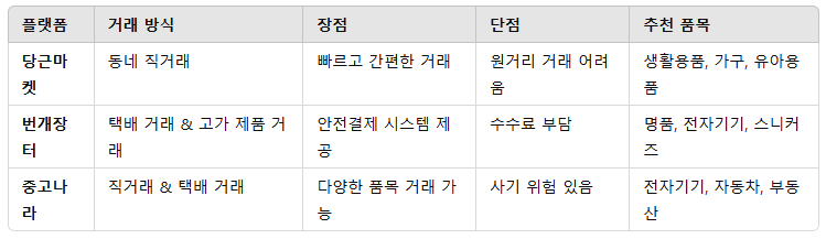 2. 당근마켓 vs 번개장터 vs 중고나라 – 거래 방식 & 주요 특징 비교