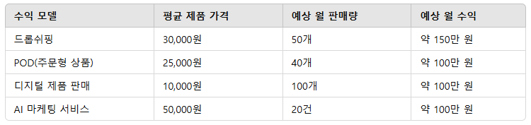 자동화 전자상거래는 다양한 수익 모델을 조합하여 운영할 수 있으며, 아래는 대표적인 모델별 예상 수익 계산표이다.