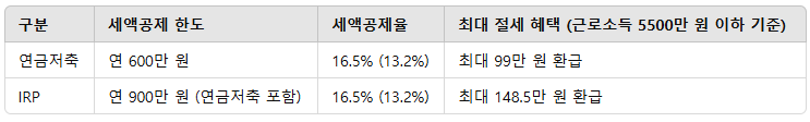 - 연금저축과 IRP를 합산하여 최대 900만 원까지 납입하면, 근로소득 5500만 원 이하 기준으로 최대 148.5만 원(16.5%)을 세액공제받을 수 있다.