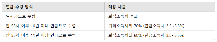 - 일시금 수령 시 퇴직소득세 부담이 크지만, 연금 수령 시 연금소득세로 절세 가능
