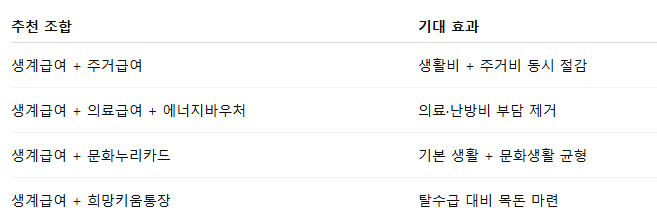 특히 “생계급여 + 주거급여” 조합은 대부분의 수급자에게 가장 도움이 되는 조합입니다.