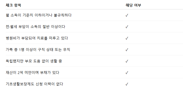 → 부모와 주소지가 같다면 부모 소득이 합산될 수 있습니다. 독립세대 분리 후 신청 시 유리할 수 있습니다.