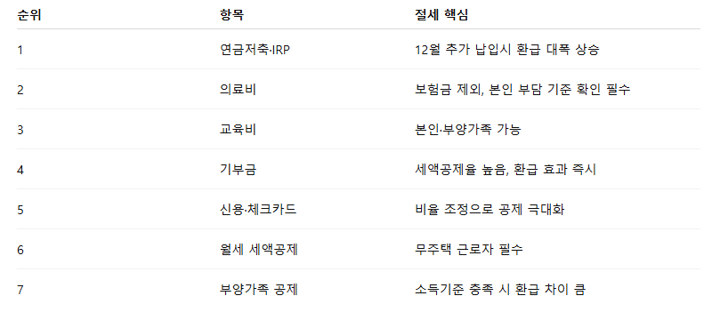 - 기부금: 공제율 높아 12월 기부 시 환급 증가 효과 큼