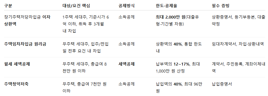 - 정의: 주택의 구입·임차·청약에 사용한 자금(이자·원리금·납입액)에 대해 소득공제 또는 세액공제를 적용하는 제도