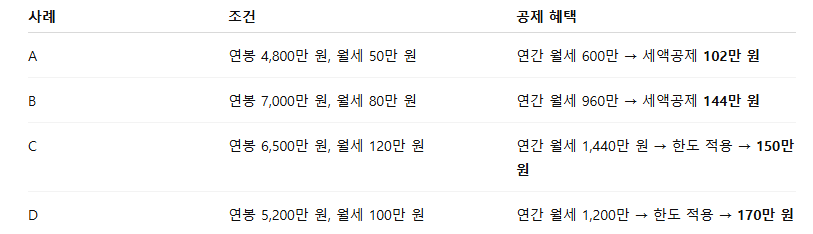즉, 월세가 많을수록 세액공제 혜택도 커지지만, 공제 한도 1,000만 원을 넘어서는 금액은 공제되지 않는 것을 기억해야 합니다.