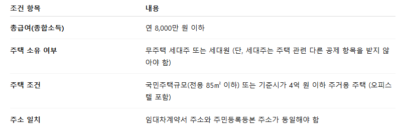 아래 조건을 모두 충족해야 월세 세액공제 대상이 됩니다: