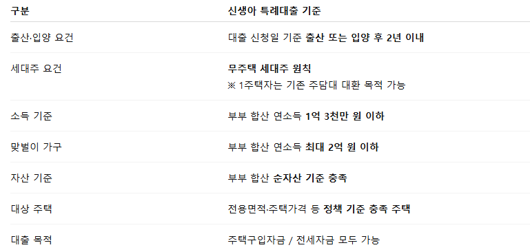 아래는 신생아 특례대출 자격조건을 표로 정리한 내용이다.